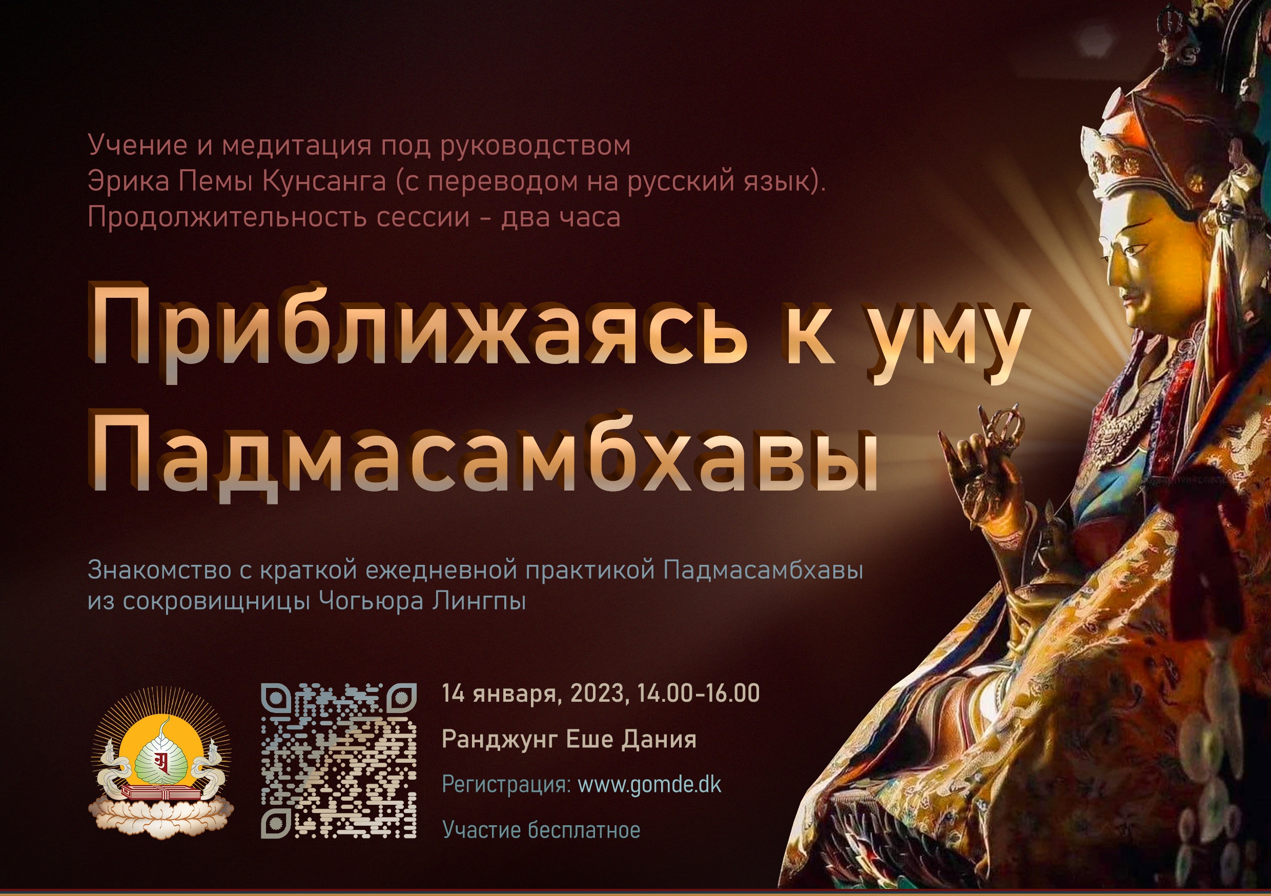 14 января 2023 в 16:00 по московскому времени (в 14:00 по времени Копенгагена) Эрик Пема Кунсанг дарует учение и проведёт медитацию по тексту краткой ежедневной практики Ламей Тукдруб Барче Кунсел «Сердечной практика Гуру, устраняющая все препятствия» (с переводом на русский язык). Продолжительность сессии – два часа.