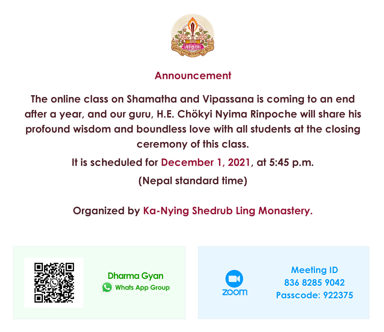 Чокьи Ньима Ринпоче дарует учение на церемонии завершения онлайн-курса по Шаматхе и Випашьяне от монастыря Ка-Ньинг Шедруб Линг, который длился в течение 2021 года. Ринпоче поделится своей глубокой мудростью и безграничной любовью со всеми учениками.