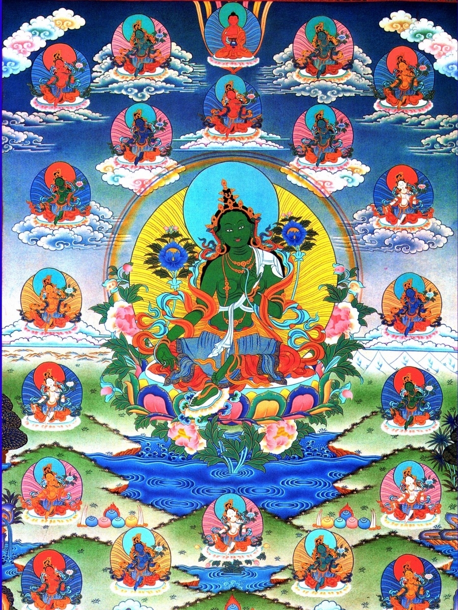 «Решимость Тары невероятна. Будда Шакьямуни поклялся пробудиться к просветлению в тот век, когда срок жизни людей уменьшится до ста лет. Считается, что его обет превосходит клятвы других будд. Сам Будда Шакьямуни, передавая сутры и тантры Тары, сказал, что среди всех будд есть два — Манджушри и Тара — чьи клятвы чрезвычайно возвышенны. Тару можно назвать эманацией матери всех будд трёх времён. Она исполняет все их активности, устраняя препятствия, созданные восемью или шестнадцатью видами страхов. Но наиболее значительно то, что она поклялась воплощаться в женском теле до тех пор, пока не опустеет самсара. Когда кто-то обращается к Таре, она реагирует быстро. Из её устремления возникли сверхъестественные активности, примеров которых предостаточно вплоть до нынешних дней. Божественной Владычице Таре поклоняются как буддисты, так и небуддисты. Существует несколько традиций практики её садханы, не только в сутре, но и в тантрах. В каждом из четырёх уровней тантры, от Крия до Ануттара тантры, есть своя собственная практика Тары».