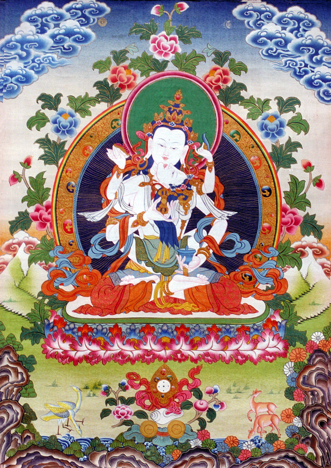 Затем мы представляем, что все лучи света возвращаются к Будде Ваджрасаттве, находящемся над макушкой нашей головы, и впитываются его телом, речью и умом. От этого его светимость, его цвет, его притягательность становятся ещё сильнее, чем раньше, даже мощнее, чем раньше.